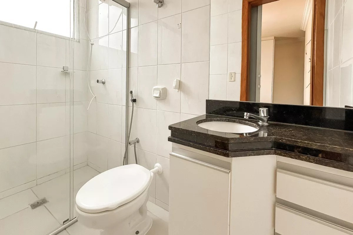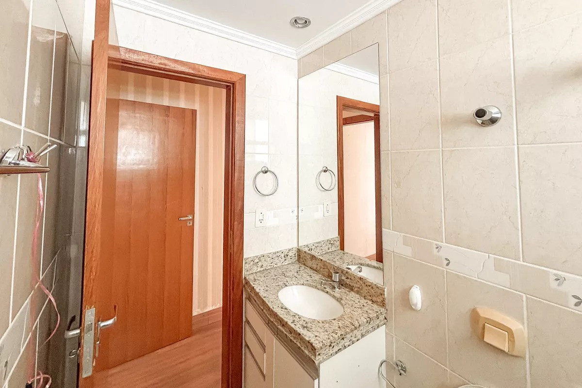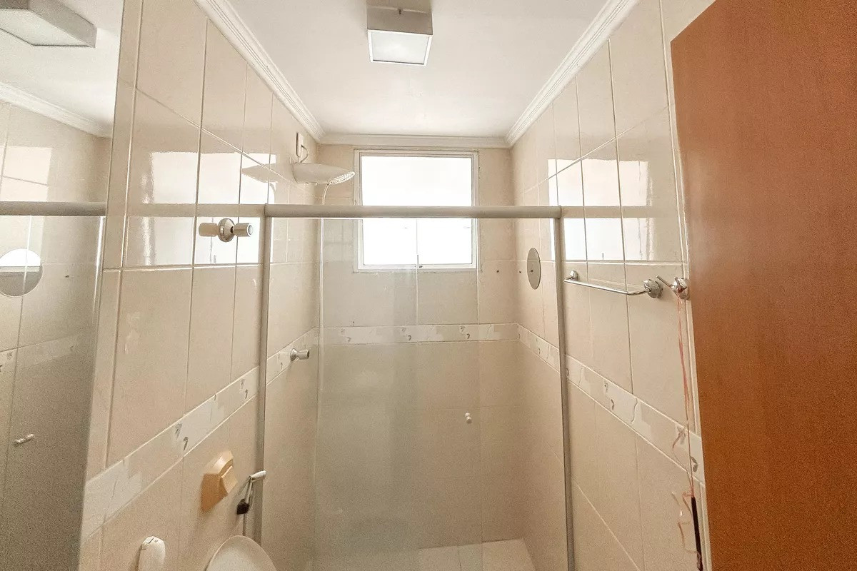 Banheiros (social e suíte) com excelente acabamento em cerâmica, armários, espelhos e box em blindex.