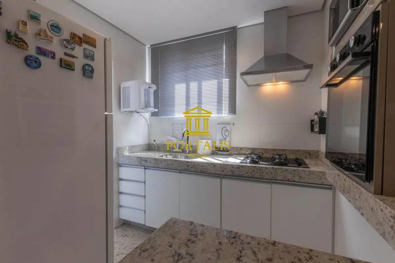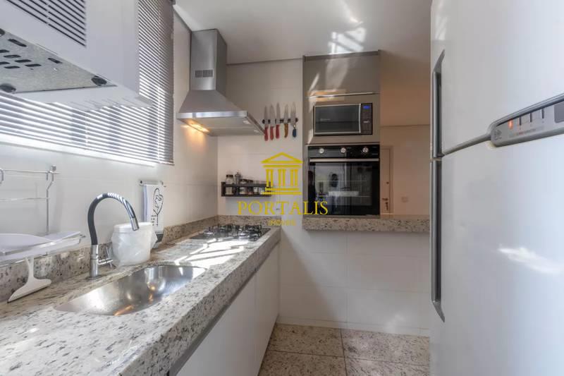 Cozinha com piso e bancada em granito, armários planejados e coifa