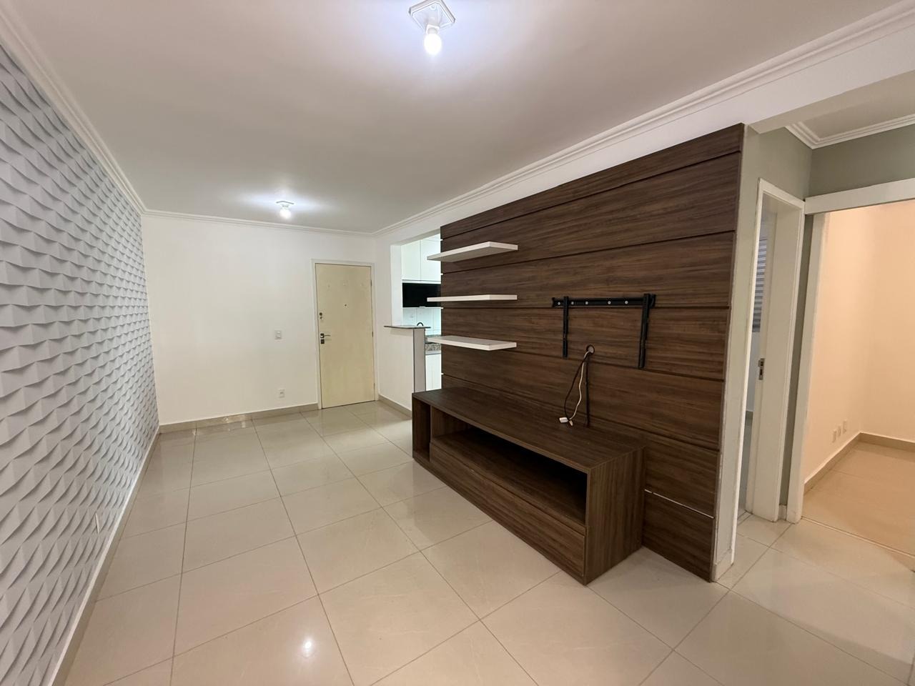 Sala ampla para dois ambientes, com piso em porcelanato e painel de madeira