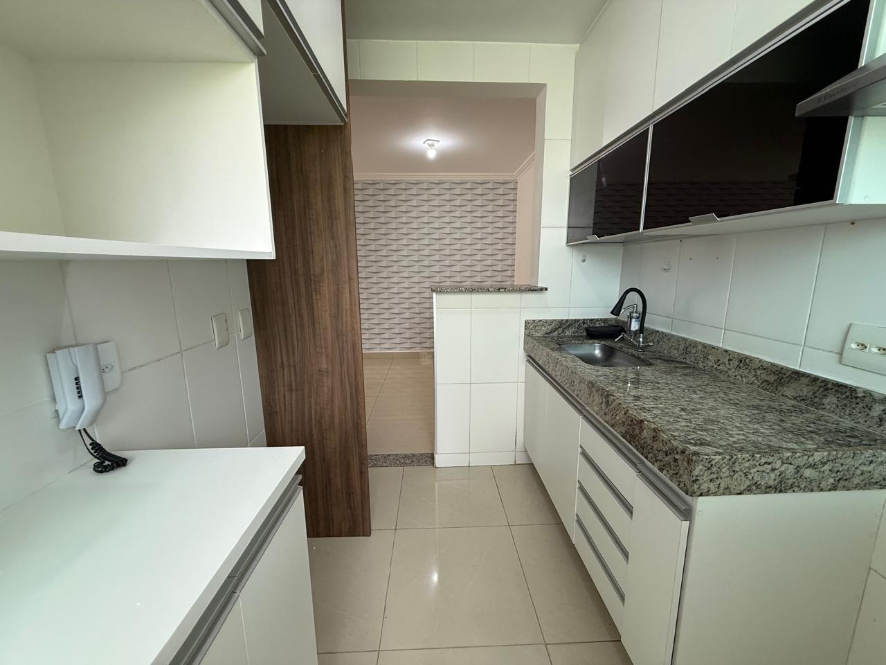 Cozinha planejada, com armários sob e sobre bancada em granito