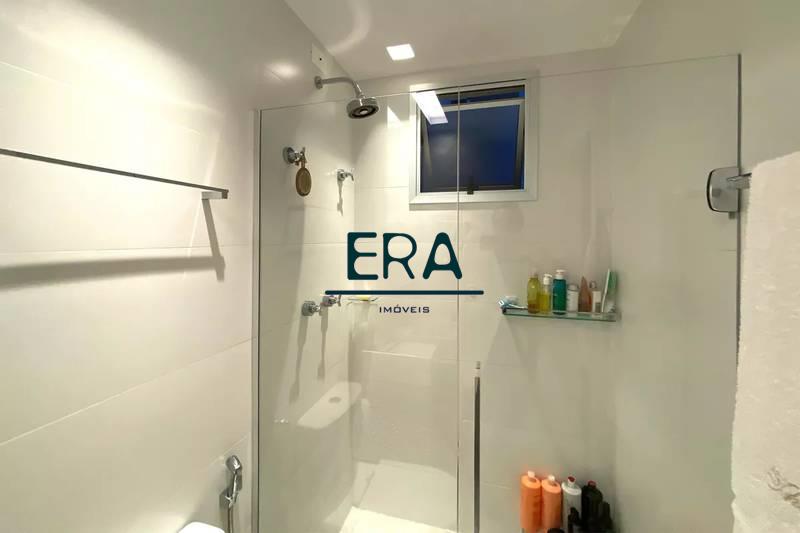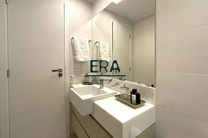 Banheiro social com espelho, bancada em granito, armários e box em blindex