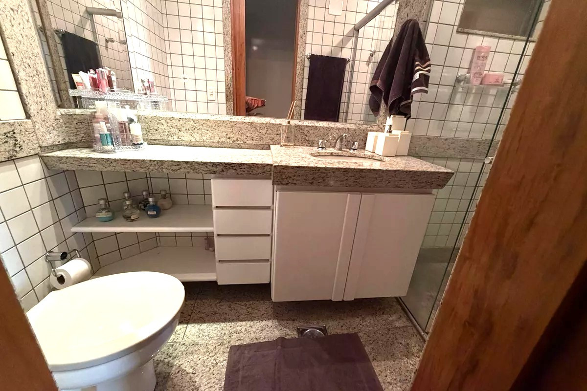 1 Sala ampla para dois ambientes, com piso em granito, teto rebaixado e iluminação planejada 3 Quartos amplos, todos com piso em tábua corrida e armários, sendo uma suíte com bancada em granito, armários, espelho e box em blindex Cozinha espaçosa, com piso e bancada em granito e armários planejados Banheiro social com espelho, bancada em granito, armários e box em blindex Área de serviço com tanque e bancada em granito 1 vaga de garagem livre e coberta