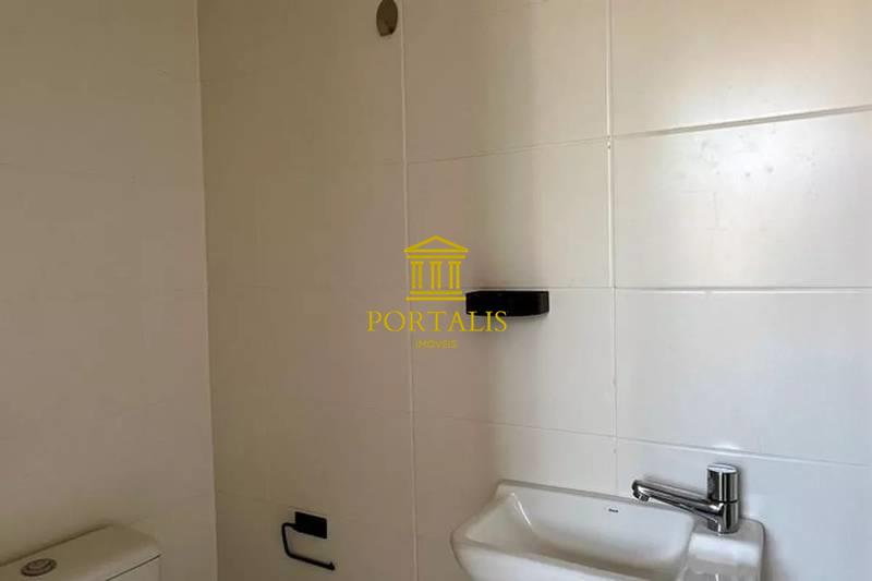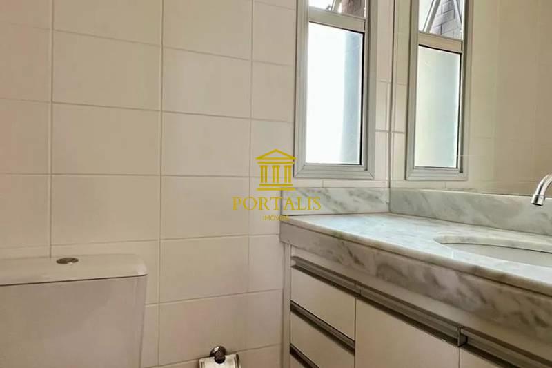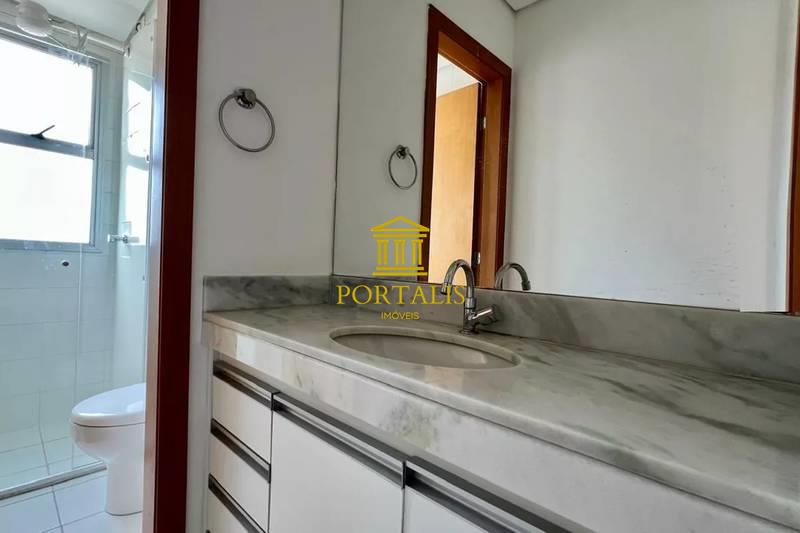 * Banheiro social (e suíte) com bancada em mármore, armários, box blindex e espelho.