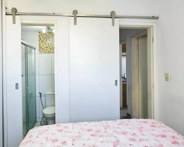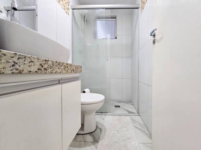 03 quartos com armários planejados e piso em porcelanato, sendo 01 suíte com bancada em granito, armário planejado e box em vidro