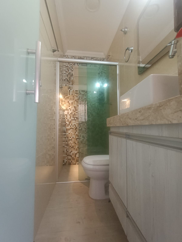 Banheiro social com armários, nicho e box em blindex