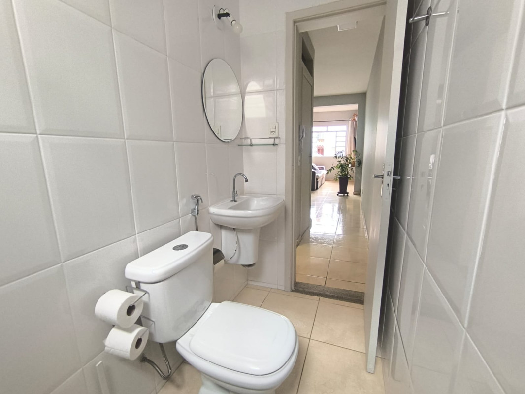 Banho social com revestimentos em cerâmica e piso em porcelanato;