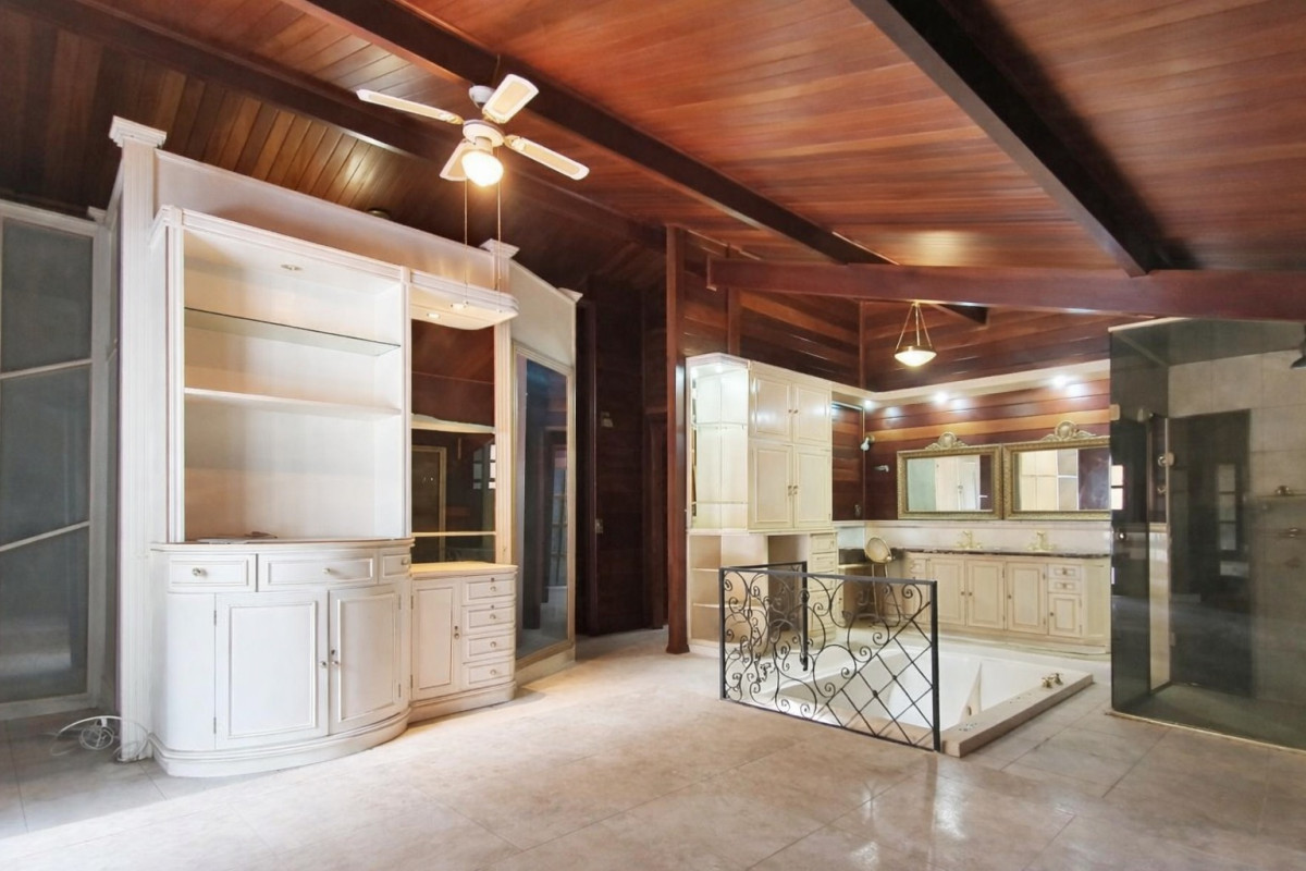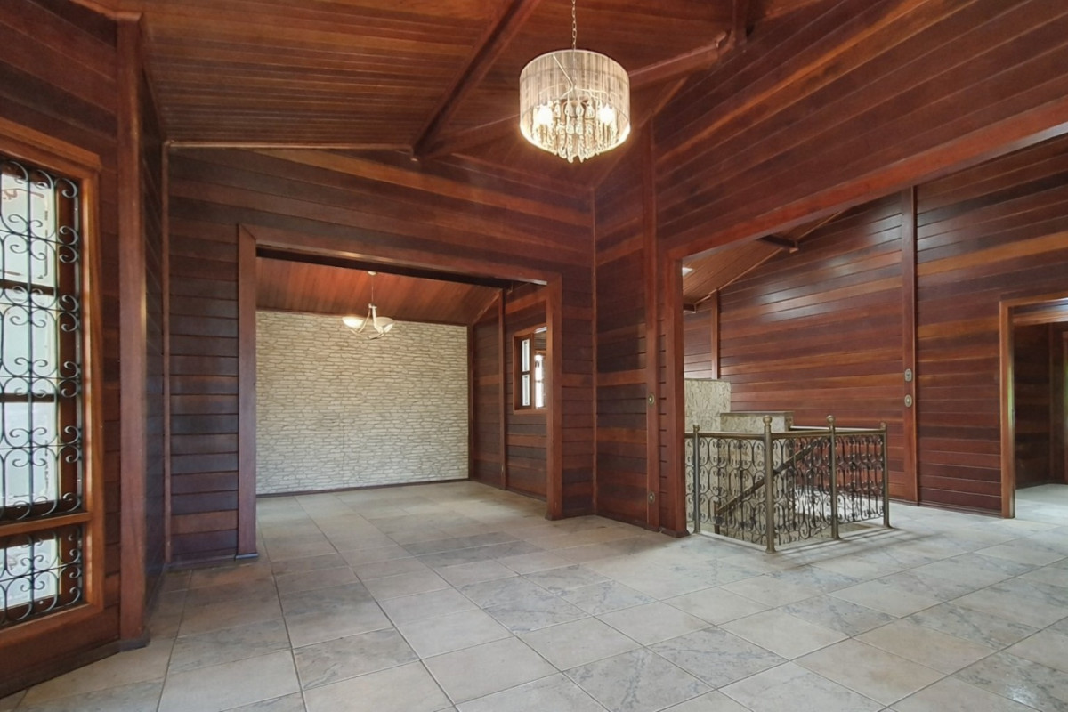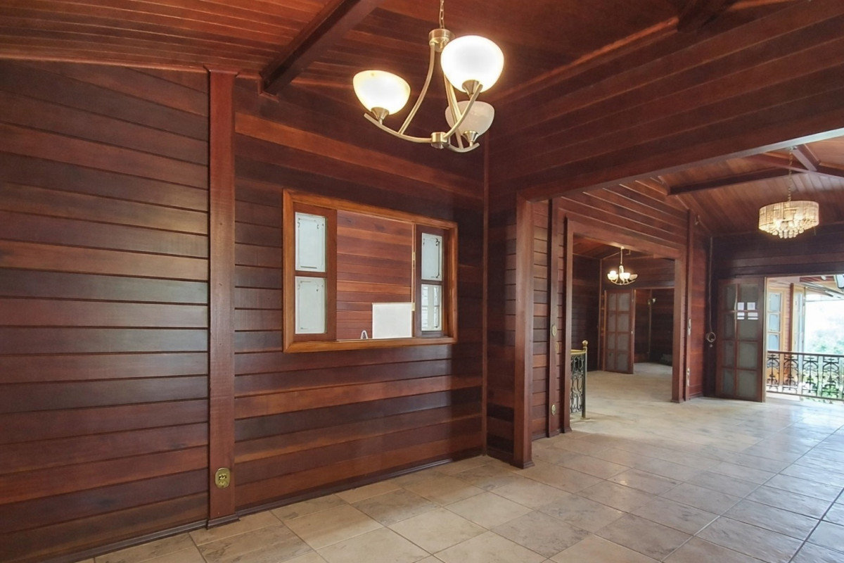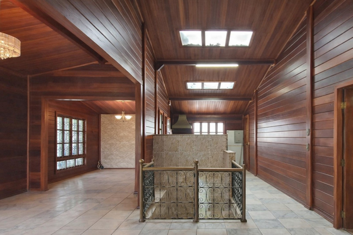 1º Pavimento: 04 salas, sendo sala de visita bem distribuída, com excelente iluminação natural; sala de jantar independente; sala com lareira em estilo medieval, trazendo charme e personalidade ao ambiente; e sala de TV e som. 03 quartos, sendo 01 suíte master com camarim, equipada com banheira de hidromassagem de 260 litros ao nível do solo, bancadas das pias em mármore italiano, espelhos em toda a área e closet com armários embutidos e mobiliário em estilo penteadeira. Varandas dos quartos protegidas por toldos fixos instalados na parte traseira da casa. Cozinha funcional, equipada com armários planejados, fogão automático de seis bocas e exaustor. Banho social com revestimentos em cerâmica, espelho e box em blindex. Área de serviço independente. Pia externa com chapa de churrasqueira. Área externa composta por jardim e gramado na parte frontal do imóvel. Varanda externa revestida em cerâmica, contornada por balaústres. Canil coberto, cercado por muro e tela.