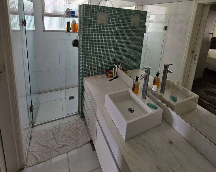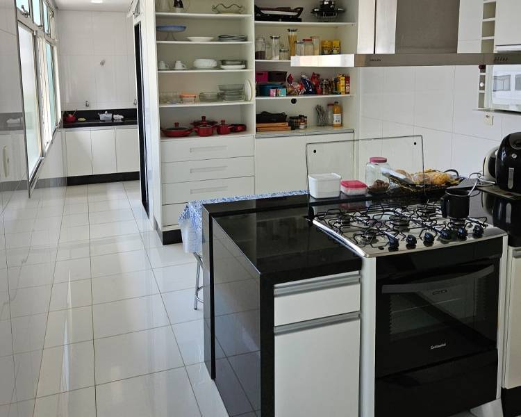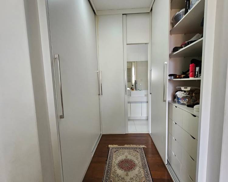 4 quartos amplos, todos com piso em tábua corrida e armários, sendo uma suíte com closet, bancada em granito, pia em cuba de apoio, teto com rebaixamento em gesso, iluminação planejada e box em blindex