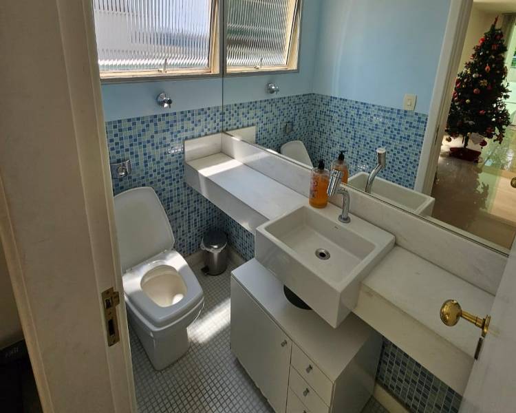 Banheiro social com bancada em granito, armários, espelho e box em blindex