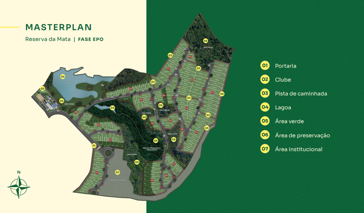 O Reserva da Mata é um condomínio fechado com portaria 24 horas e infraestrutura completa. Conta com ruas pavimentadas, água e energia por concessionárias, pista de caminhada integrada às áreas verdes, lagoa e clube exclusivo com piscinas, sauna, espaço fitness, quadra de tênis, espaço gourmet, churrasqueira e ambientes de convivência.